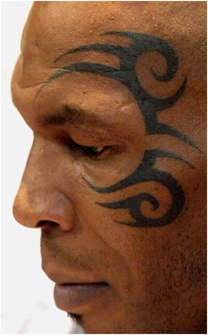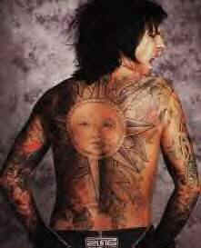 has tribal blackwork on his arms, chest and back, as well as the sides of his head and the
